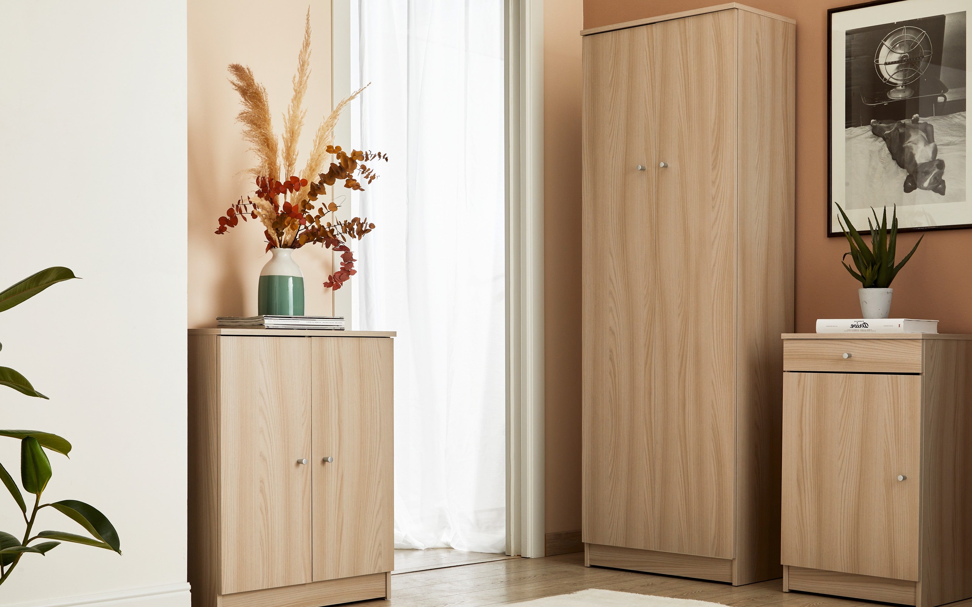 Offering contemporary designed storage solutions, this wardrobe is available in three muted color combinations that complement your decor. Two doors open onto a large space, with three adjustable shelves where you can store, clothes, suits and other items.